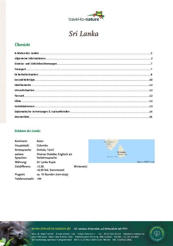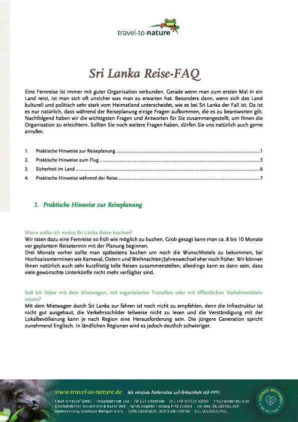 Eine Reise nach Sri Lanka bedarf im Vorfeld einer guten Organisation. Gerade wenn Sie zum ersten Mal nach Sri Lanka reisen und vielleicht auch mit der ganzen Familie unterwegs sind, wollen Sie sich sicherlich genau wissen, worauf Sie sich einlassen. Nicht nur in Sachen Reiseplanung im Vorfeld, sondern auch wenn es um Kleinigkeiten vor Ort geht, die in der Heimat anders sind. Nachfolgend stellen wir Ihnen alle Unterlagen zur Verfügung, die das Reiseland Sri Lanka betreffen. Sollten Sie noch weitere Fragen haben, rufen Sie uns gern an unter +49 7634/5055-0 oder schreiben Sie uns eine E-Mail an info@traveltonature.de.