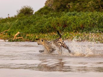 Jaguare unterscheiden sich deutlich von Löwen, Leoparden oder Tigern. Während diese meist im Schatten ruhen oder nur kurz zu sehen sind, zeigen sich die Jaguare von Porto Jofre häufig über längere Zeit. Oft kann man sie beobachten, wie sie am Ufer entlang patrouillieren oder aus dem Nichts zur Jagd ansetzen. Auch zur Mittagszeit!