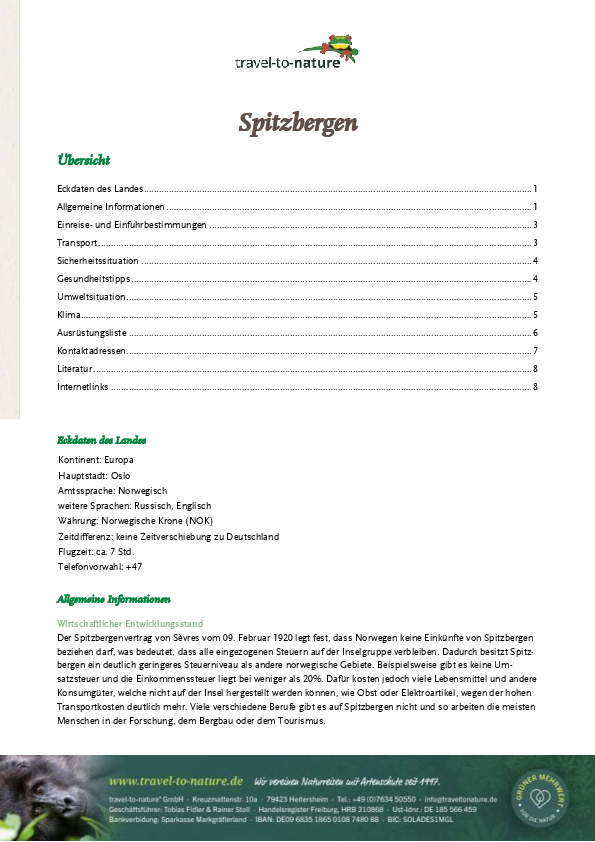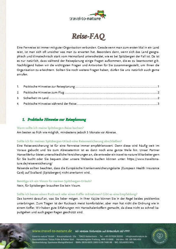Eine Reise nach Spitzbergen bedarf im Vorfeld einer guten Organisation. Gerade wenn Sie zum ersten Mal nach Spitzbergen reisen und vielleicht auch mit der ganzen Familie unterwegs sind, wollen Sie sich sicherlich genau wissen, worauf Sie sich einlassen. Nicht nur in Sachen Reiseplanung im Vorfeld, sondern auch wenn es um Kleinigkeiten vor Ort geht, die in der Heimat anders sind. Nachfolgend stellen wir Ihnen alle Unterlagen zur Verfügung, die das Reiseland Spitzbergen betreffen. Sollten Sie noch weitere Fragen haben, rufen Sie uns gern an unter +49 7634/5055-0 oder schreiben Sie uns eine E-Mail an info@traveltonature.de.