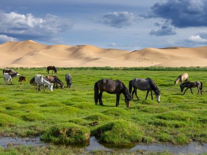 Nach dem Frühstück brechen wir zu den beeindruckenden Khongor-Sanddünen, die auch als die berühmten „Singenden Dünen“ bekannt sind. Wie einst die Nomaden der alten und heutigen Mongolei Heute führt uns die Fahrt nach Narandaats, einem wahren Geheimtipp und versteckten Paradies inmitten der Gobi-Wüste. In dieser überraschend grünen Oase wachsen Saxaulbäume, Tooroi und Khailaas hoch und dicht lebendige Zeugen einer uralten Landschaft, die vor Hunderttausenden von Jahren entstand, als noch Dinosaurier durch die Ebenen der Gobi streiften.