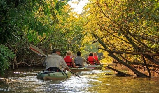 Paddeln Sie mit Einbaum-Kanus entlang von Schwarzwasserbächen und Seen, vorbei an üppigen Lianen, Bromelien und riesigen Palmen. Lassen Sie sich von den Naturwundern des Amazonas verzaubern.
