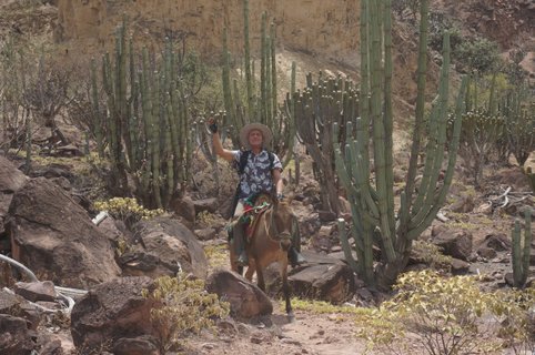 Heute wachen wir mitten im Nirgendwo auf. Nach dem Frühstück packen wir unsere Ausrüstung, beladen die Pferde für die nächste Etappe, die uns weiter das Marañon-Tal entlang dieses großartigen Flusses hinunterführt. Es ist wild und schön, wahrscheinlich sehr heiß und trocken. Während wir auf dem Pferd sitzen und diese karge Landschaft überblicken, könnte man meinen, wir wären in einem Film. Die Anden sind nicht nur hohe Berge; sie bestehen auch aus vielen tiefen Tälern mit einer großen Anzahl von Mikroklimatas. Die Anden sind in Peru am breitesten, mit drei großen Gebirgszügen: dem westlichen, der sich zum Pazifik hin orientiert, dem zentralen und dem östlichen, der sich zum Amazonas hin orientiert. Dazwischen gibt es unzählige Täler, in denen Menschen völlig isoliert leben. Schließlich erreichen wir das kleine Kokadorf Tupén. Eine weitere idyllische und unwirkliche Oase in dieser trockenen und kargen Landschaft. Hier halten wir an, um in den Stromschnellen zu schwimmen und später bei unserer Gastgeberin Luzita eine gute Hühnersuppe zu genießen. Tupén hat eine schmerzhafte Geschichte. In den 1990er Jahren wurde Tupén noch immer nach stark feudalistischen Prinzipien durch das alte spanische Hazienda-System aus der Kolonialzeit betrieben. „El patron“ war einfach ein despotischer Sklaventreiber, der diese kleine Gemeinschaft mit eiserner Faust regierte, bis er von der revolutionären marxistisch-leninistischen Gruppe MRTA gefangen genommen wurde. Die Tatsache, dass die Sklaverei in Peru offiziell 1854 abgeschafft wurde, zeigt, dass es in diesem Land immer noch Möglichkeiten gibt, aus dem formellen und regulierten Peru zu verschwinden und in völliger Isolation zu leben. Dieses Tal ist so außergewöhnlich anders, dass wir etwas Zeit hier unten in dieser Tiefe, weit abseits der ausgetretenen Pfade, verbringen. Es wird eine äußerst einzigartige Erfahrung sein. Wir werden über Nacht bei Don Cesar und Doña Luzita bleiben. Der Hausherr hat einige Rechte von seinem Großvater Don Eduardo geerbt, was bedeutet, dass er zu den größten Kokabauern im Tal gehört und eine zentrale Stelle in dieser Gemeinschaft einnimmt.