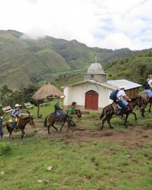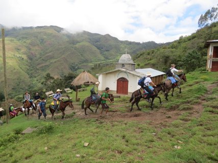 Es wird ein weiterer langer und ziemlich anspruchsvoller Tag werden - etwa 10 Stunden. Aber am Ende der Etappe des Tages werden wir mit herausragender und kontrastreicher Natur sowie spektakulären Panoramen belohnt. Und am Ende des Tages erwartet uns eine weitere idyllische und abgelegene Gemeinschaft auf dem Bergkamm über dem Marañon-Tal. Nach einem frühen Frühstück bei unserem Gastgeber in Corontas machen wir uns bereit zur Abfahrt. Wir starten zu Fuß, während die Pferdeführer die Pferde satteln und die Fracht auf die Pferde laden. Nach einer Weile werden die Pferde zu uns aufschließen, was perfekt ist, denn nun geht es eine Weile stetig bergauf. Die Vegetation in dieser Gegend ist trocken, wenn es nicht Regenzeit ist, aber normalerweise ist es in diesen Taschen des Wolkenwaldes sehr feucht. Schließlich erreichen wir den Hang, und es öffnet sich ein fantastischer Panoramablick über das Marañon-Tal. Wir werden entlang des Hanges weitergehen, bis er endet, und genau vor uns werden wir das heutige Ziel sehen, die Gemeinschaft San Ramon. Mit diesem großartigen Blick machen wir uns für ein Mittagessen im Freien bereit. Die Pferde lieben es, sich hier im Gras zu wälzen. Von hier aus werden wir etwa 800 Höhenmeter steil absteigen. Es wird merklich wärmer, und unter uns können wir das angenehme Rauschen eines der Nebenflüsse des Marañon hören. Ein Bad wird sehr willkommen sein. Wir bringen die Pferde hinüber und machen uns bereit, nach San Ramon zu reiten. Es wird anderthalb Stunden zu Pferd dauern, bis wir die Zucker- und Kakaoplantagen am Eingang der Gemeinschaft erreichen. Schließlich erreichen wir den Gipfel und kommen auf einem Platz mit einer Schule und einer kleinen katholischen Kapelle an. Es ist spätnachmittags, und die Leute entspannen sich hier auf dem Gras, während Kinder und Jugendliche Fußball und Volleyball spielen. Unsere Gastgeberin heißt Juana. Ihre Familie hat ihr eigenes Stück Land mit Zuckerrohr und Kakao. Juana hat eine gute Küche und kann uns alle mit Betten unterbringen. Auch nach einem langen und anstrengenden Tag tanken wir irgendwie mit Essen von Juana und dem Kontakt zu all den aufmerksamen und freundlichen Menschen um uns herum wieder Energie. Wir werden höchstwahrscheinlich eine gute Nacht haben - das Klima hier ist etwas kühler und angenehmer.